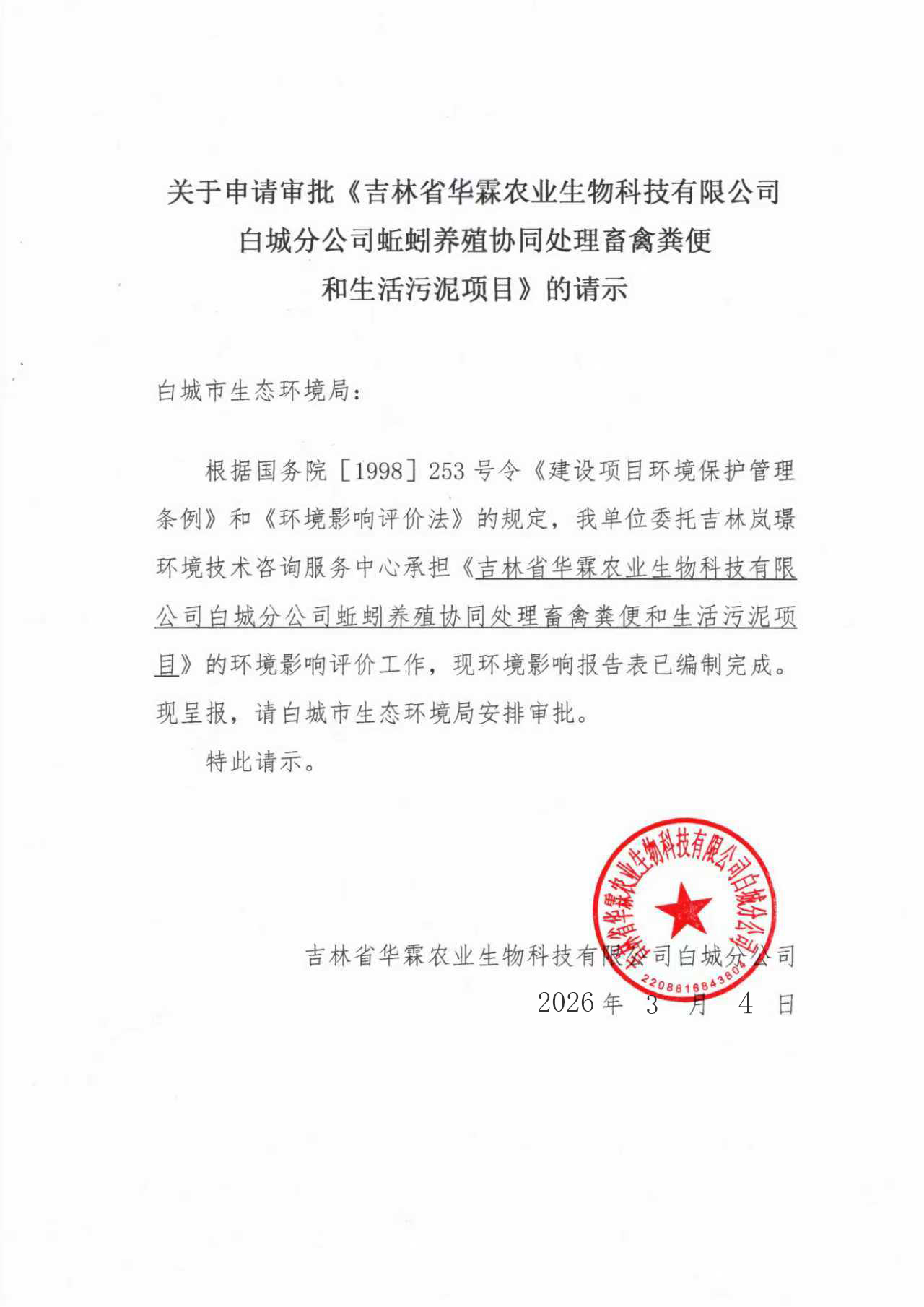 根据建设项目环境影响评价审批程序的有关规定,现将《吉林省华霖农业生物科技有限公司白城分公司蚯蚓养殖协同处理畜禽粪便和生活污泥项目环境影响报告表》项目受理情况予以公示,公示期为3天。 联系电话:6322317